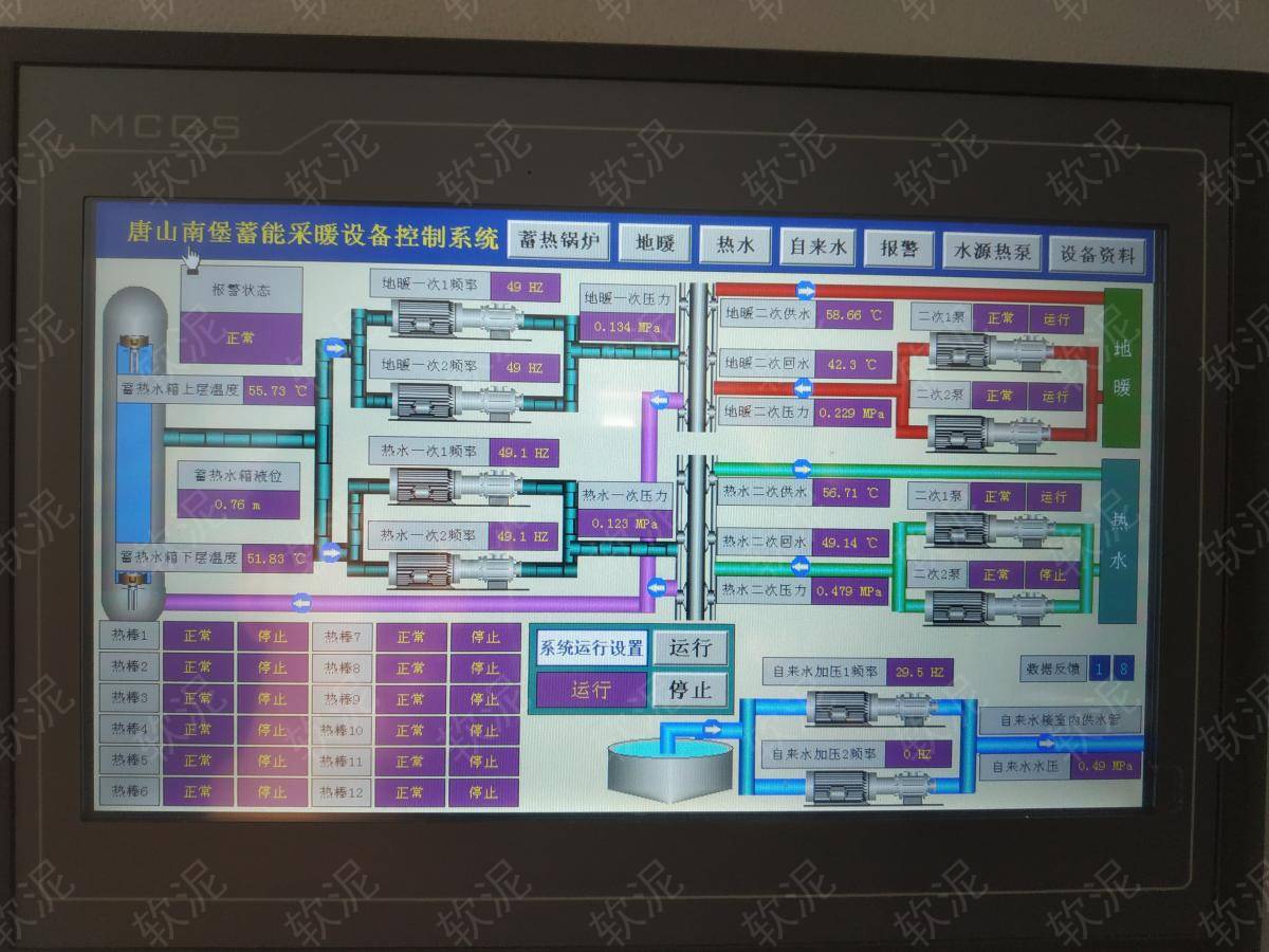 | 1. 項(xiàng)目位于唐山市曹妃甸區(qū),北堡村附近。加壓泵使用變頻器根據(jù)管道反饋水壓自動(dòng)調(diào)速運(yùn)行頻率,維持自來(lái)水水壓恒定。熱水通過(guò)板式換熱器獲得蓄熱水箱的熱能,維持熱水恒溫。 2. 水箱蓄熱功能自動(dòng)運(yùn)行,反饋電流異常時(shí)能自動(dòng)顯示故障信息(當(dāng)?shù)仉妰r(jià)沒(méi)有峰谷) 3. 制熱時(shí)二次網(wǎng)水泵不間斷運(yùn)行,一次網(wǎng)水泵通過(guò)間歇運(yùn)行給板式換熱器維持恒定溫度,從蓄熱水箱獲取熱源。沒(méi)有制冷功能。 4. 所有傳感器和設(shè)備運(yùn)行數(shù)據(jù)接入軟泥物聯(lián)網(wǎng)系統(tǒng),機(jī)房自動(dòng)運(yùn)行無(wú)人值守,通過(guò)手機(jī)軟件可隨時(shí)查看設(shè)備運(yùn)行情況和修改設(shè)定參數(shù)。 |