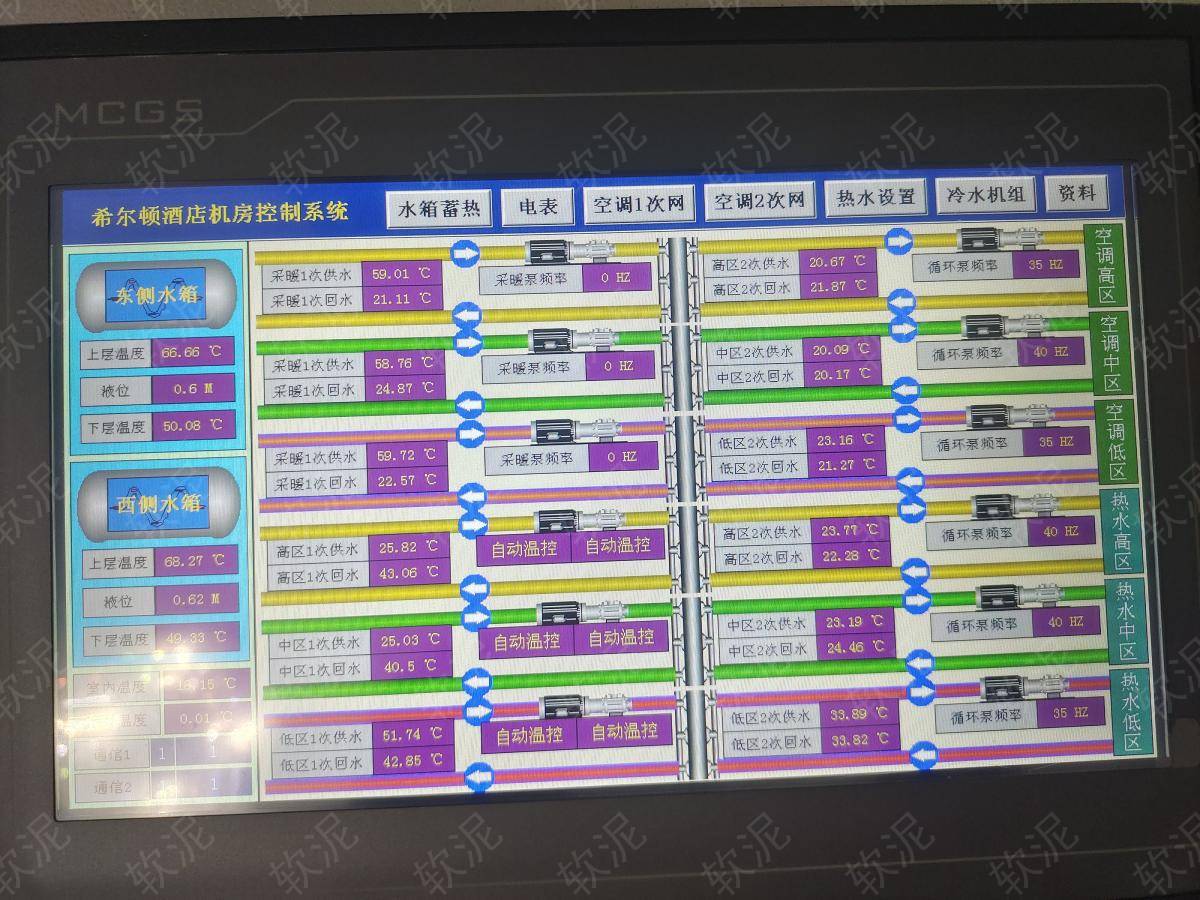 | 1. 項目位于秦皇島市海港區(qū)河濱路92號希爾頓歡朋酒店,功能包括谷電蓄熱(兩個續(xù)熱水箱)、谷電蓄冷(給消防水池降溫蓄冷)、熱水循環(huán)、空調(diào)水循環(huán)。 2. 蓄熱期間兩個蓄熱水箱各自溫控,蓄冷期間中央空調(diào)給消防水池降溫,只在谷電價格期間運行,節(jié)約電費。 3. 高區(qū)中區(qū)地區(qū),有各自的熱水循環(huán)泵和空調(diào)循環(huán)泵,水壓不同,各自的水循環(huán)系統(tǒng)獨立溫控。 4. 自動模式根據(jù)設定參數(shù)能自動啟停設備,手動模式可以直接操作每個設備啟停用于檢修。 5. 機房24小時有人值班,每人實名制賬戶,操作記錄自動存檔。設備分布在地下一層和地下二層的很多房間,通過軟泥物聯(lián)網(wǎng)平臺能夠統(tǒng)一管理,直觀的看到所有傳感器和水泵的反饋數(shù)據(jù)。 6. 所有功耗較大的設備都加裝的電表,進行電流檢測和耗電量統(tǒng)計,自動抄表,可檢索,數(shù)據(jù)可導出Excel文件下載。 |