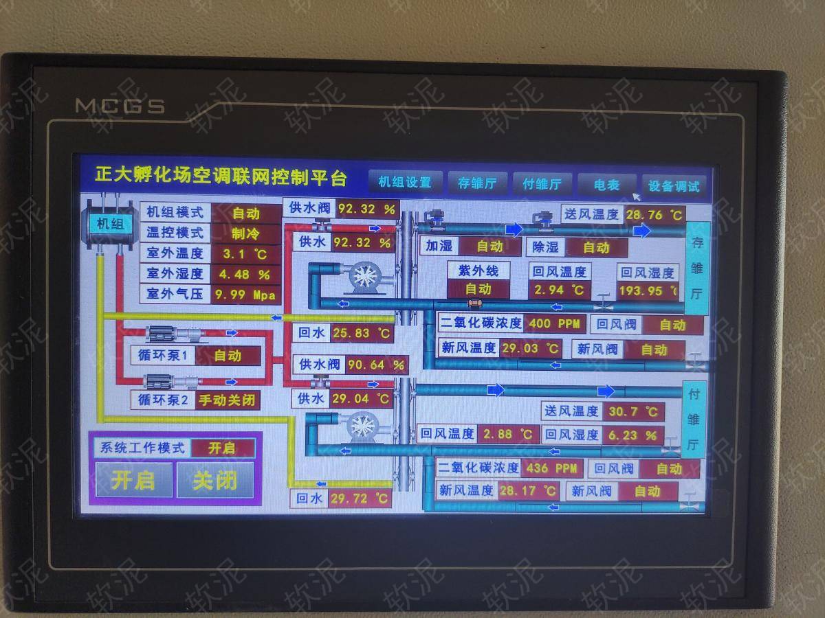| 1. 中央空調(diào)系統(tǒng)為雛雞提供舒適的生存環(huán)境,避免驟冷驟熱刺激,同時使用二氧化碳檢測傳感器對環(huán)境進(jìn)行檢測,ppm過高時緩慢調(diào)節(jié)新風(fēng)閥比例加入新風(fēng)。 2. 使用壓差傳感器對室內(nèi)外氣壓進(jìn)行檢測,通過調(diào)節(jié)回風(fēng)閥比例實(shí)現(xiàn)室內(nèi)正壓環(huán)境,避免室外污染物進(jìn)入。 3. 軟泥聯(lián)網(wǎng)設(shè)備能將所有傳感器數(shù)據(jù)實(shí)時傳入云端,所有工作人員均可查看和操作,不限人數(shù)。每人建立實(shí)名賬戶,任何操作均產(chǎn)生操作記錄。 |
